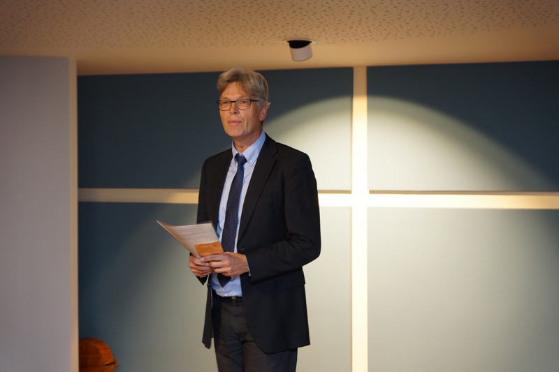 Noch vor der Tür führte unser jüngstes Ensemble, die Theaterklasse 5c, eine Kobold-Performance auf, bevor Schulleiter Berthold Lannert zusammen mit der Schülerin Michaela Kopp das Band durchschnitt. Drinnen drängten sich die Besucher und lauschten Henrike und Merete Reicherts Musik und den Worten des Vorsitzenden der Evang. Schulstiftung Hans-Peter Krüger, bevor der Raumsegen die Eröffnung beschloss.