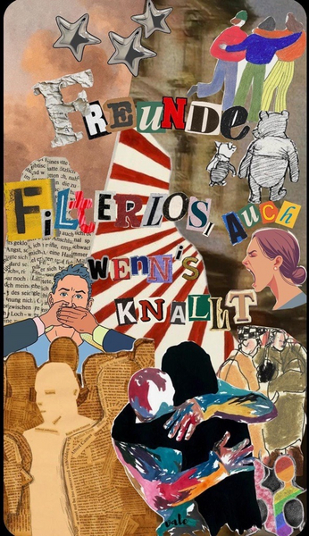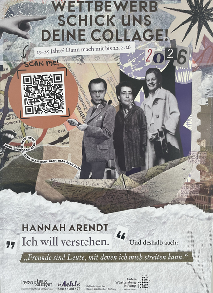 Das Literaturhaus Stuttgart lud zu Anfang des Jahres junge Menschen zwischen 15 und 25 Jahren zu einem großen Gestaltungswettbewerb ein. Unter dem Motto Hannah Arendt – Ich will verstehen finden über das ganze Jahr im Literaturhaus viele interessante Programmpunkte wie Lesungen, Interviews und Forschungsaustausch statt. Das Ziel ist die Auseinandersetzung mit dem Werk der großen politischen Theoretikerin und der Idee des Pluralismus als Voraussetzung der Demokratie. Im Wettbewerb sollte Hannah Arendts Zitat: „Freunde sind Leute, mit denen ich mich streiten kann“ visualisiert werden. Wir freuen uns sehr, dass zwei unserer Abiturientinnen aus dem Leistungskurs Kunst teilgenommen und gewonnen haben: Angelina Prce und Marleen Siegmund! Wir gratulieren dazu sehr herzlich! Außer den Jugendlichen haben auch 16 Lyriker:innen aus 15 Ländern verschiedene Collagen gestaltet. Deren Werke und alle Arbeiten der Gewinner:innen des Wettbewerbs werden bis 24.07.26 im Literaturhaus, Breitscheidstr. 4 und in der Cafébar Consafos, Königstr. 33 in Stuttgart ausgestellt.