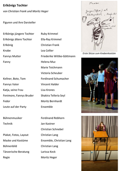 Wir möchten allen für die guten und bestärkenden und für die konstruktiven Rückmeldungen danken, die den Abschluss des Theaterstücks "Erlkönigs Tochter" begleitet haben: Schon wieder ist etwas vorbei! Nach intensiver Vorbereitung, viel Probenzeit und dem geglückten Experiment, in dem Neuntklässler und Oberstufenschüler gemeinsam auf der Bühne standen, ist diese Besetzung leider Geschichte. Was kommen wird? TODC macht jedenfalls weiter, ein nächstes Stück soll es im November 2018 geben. Wer mitmacht, ist noch offen: Meldet euch! Nach dem Stück ist vor dem Stück.