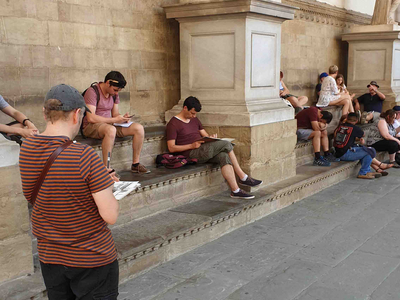 Auf ihr Bett im Hotel, das ein früheres Kloster war, freuten sich dann alle. In den folgenden Tagen wurde es sehr sonnig. Immer dabei waren eigens gefertigte Skizzenbücher, in die bei allen Unternehmungen gezeichnet werden konnte, wofür neben Referaten und Besichtigungen extra Zeit eingeplant war. Es entstanden Zeichnungen aus ganz alltäglichen Beobachtungen oder in direkter Begegnung mit Renaissance-Originalen, z.B. vor Michelangelos Figuren in der Medici-Kapelle, vor den Skulpturen in der Loggia dei Lanzi, in den Boboligärten, vor San Miniato al Monte, im Bargello oder den Uffizien, in den Kreuzgängen von Santa Maria Novella… . Abends wurde erstaunlich viel Pizza gegessen.